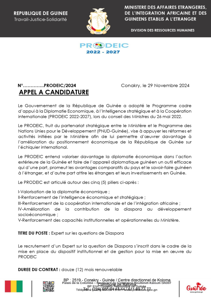 Appel à candidature pour le poste de Expert sur les questions de Diaspora