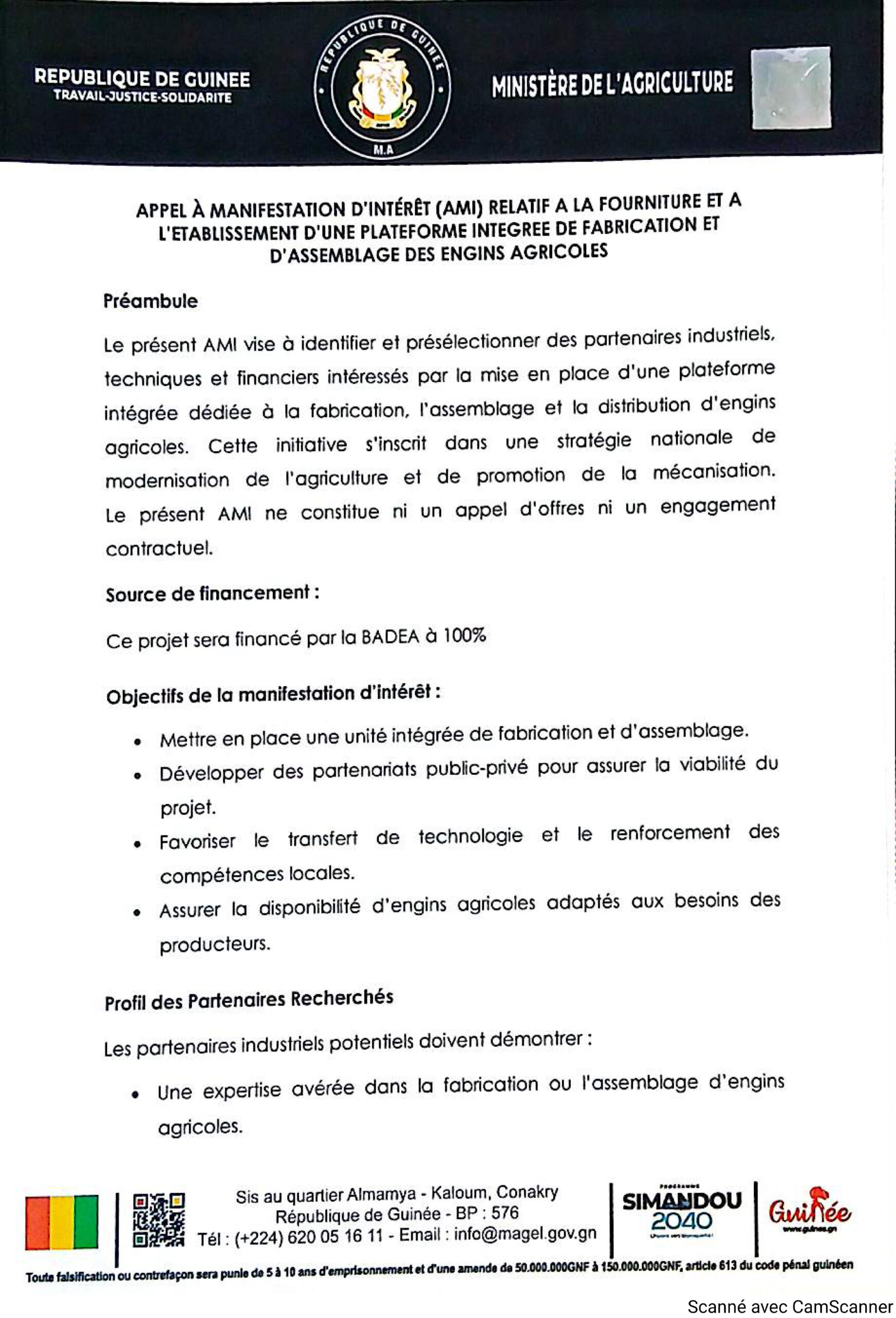 Annonces APPEL À MANIFESTATION D’INTÉRÊT (AMI) RELATIF A LA FOURNITURE ET A L’ETABLISSEMENT D’UNE PLATEFORME INTEGREE DE FABRICATION ET D’ASSEMBLAGE DES ENGINS AGRICOLES 27 janvier 2026 14 h 24 min Téléchargez l’avis complet en PDF http://linterieur.net/wp-content/uploads/2026/01/CamScanner-27-01-2026-12.15.pdf
