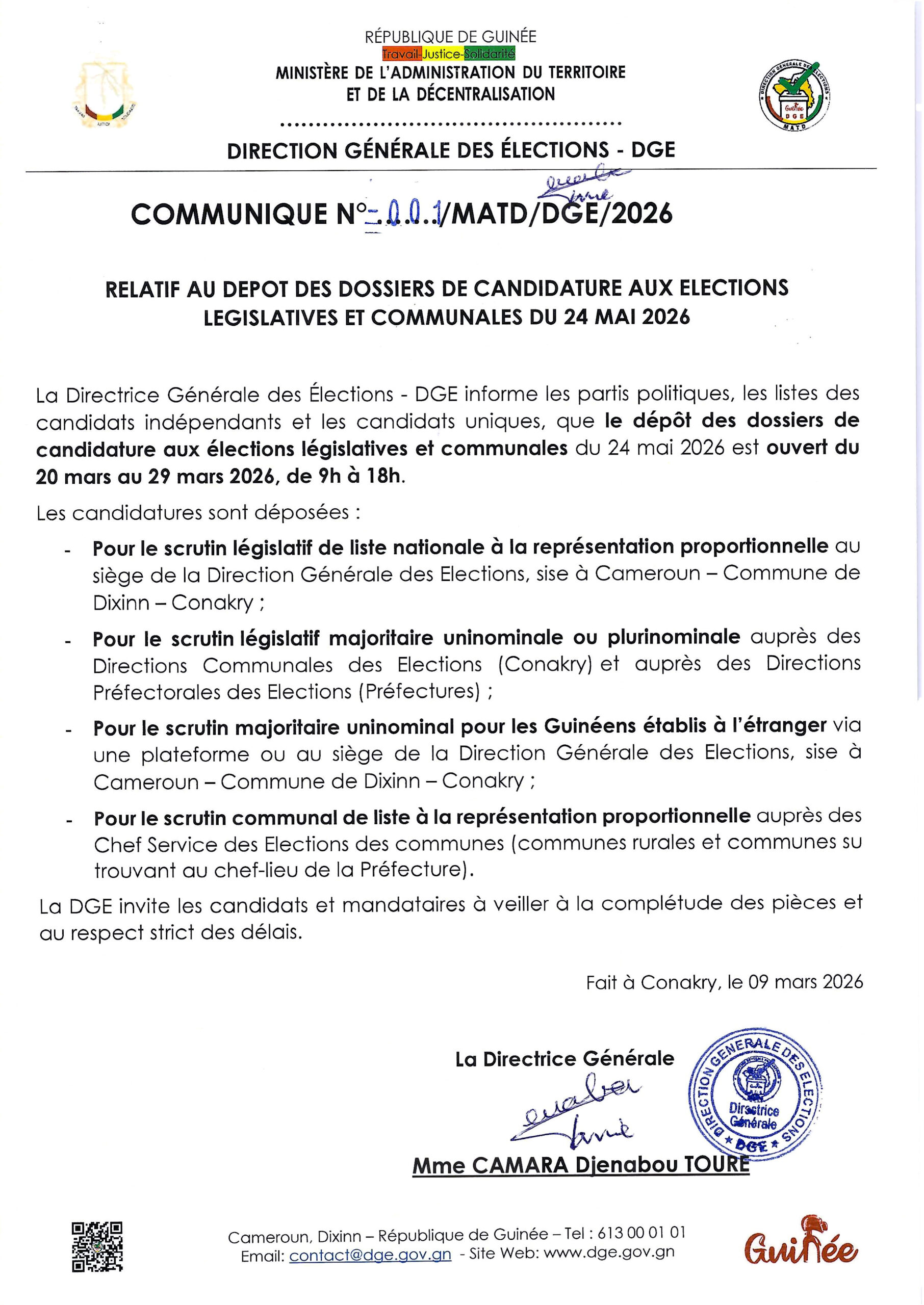 Actualité COMMUNIQUE N° 001-MATD-DGE-2026 RELATIF AU DEPOT DES DOSSIERS DE CANDIDATURE AUX ELECTIONS LEGISLATIVES ET COMMUNALES DU 24 MAI 2026. 10 mars 2026 13 h 08 min
