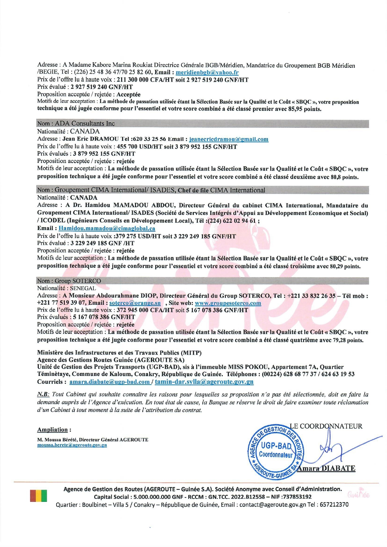 Annonces PUBLICATION DE L’ATTRIBUTION DU CONTRAT RELATIF AUX ETUDES D’EVALUATION DES IMPACTS SOCIO-ECONOMIQUES DU PROJET DE CONSTRUCTION ET BITUMAGE DE LA ROUTE BOKE-QUEBO PHASE1/LOT2 (41KM) 10 février 2025 12 h 07 min